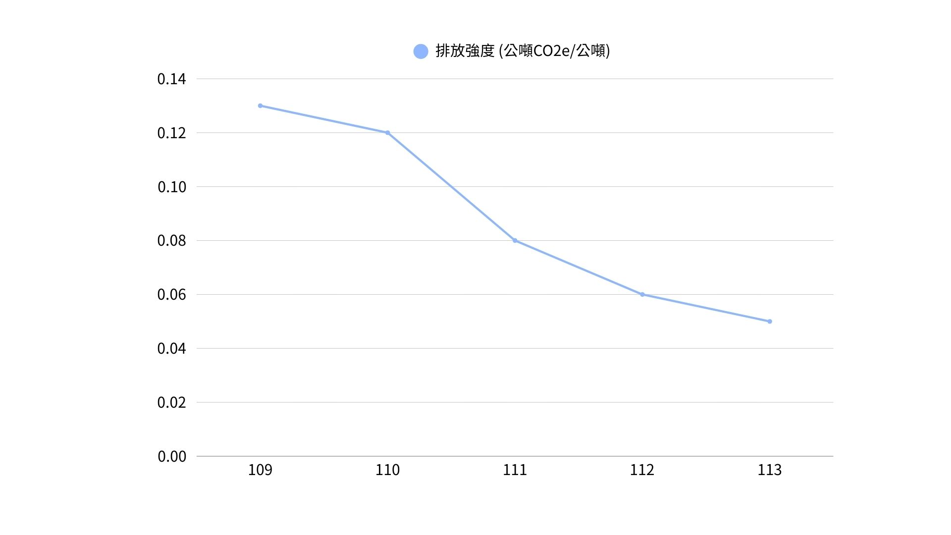 本公司自109年投產營運以來,雖建造全球首創製程而面臨諸多運轉挑戰,但透過不斷的投入研發與創新,藉由操作參數調整以及營運人力調配,達到耗能最佳化同時降低用電量,進而可將電弧爐煉鋼還原碴再利用量提昇,並使CO2溫室氣體排放量大幅下降。截至113年底,相較於109年,台鋼資源每噸爐碴節能減碳成效達61.5%,成效卓越。近五年爐碴再利用量、CO2溫室氣體排放量、單位排放強度、與增減比例如下表及下圖所示: