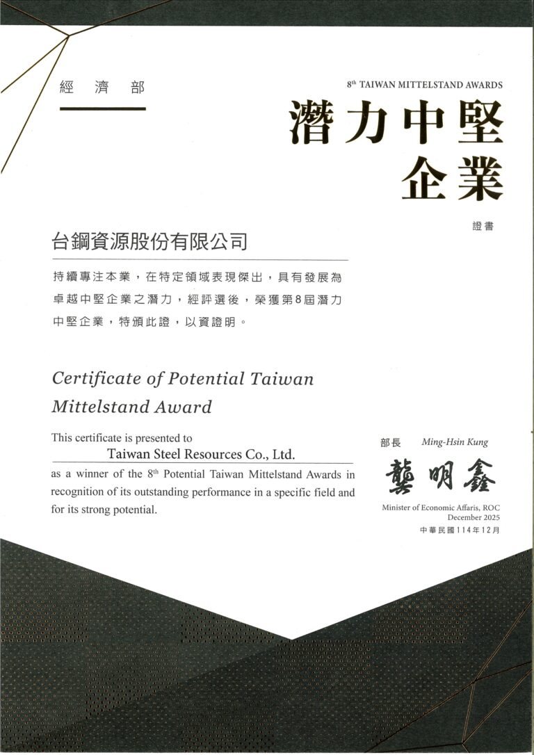 經濟部公布第 8 屆「潛力中堅企業」名單,台鋼資源股份有限公司憑藉深耕本業、在特定領域的穩健表現與成長潛力獲選肯定,展現中堅企業在產業升級與永續發展上的關鍵角色。